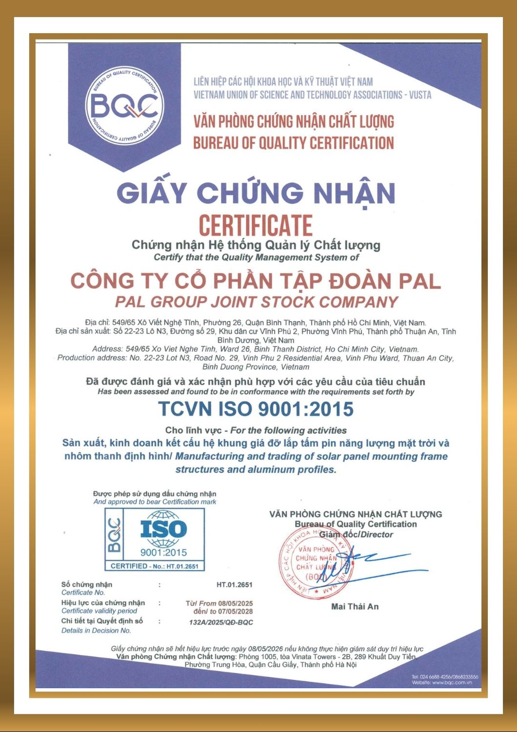 PAL GROUP là một công ty hoạt động trong lĩnh vực sản xuất, phân phối thiết bị điện và phụ kiện lắp đặt tấm pin năng lượng mặt trời được thành lập vào năm 2018. Chúng tôi luôn đi đầu về sự uy tín, chất lượng với giá cả phù hợp khi cung cấp sản phẩm ra thị trường trong nước và xuất khẩu. Công ty luôn tự hào là một đơn vị có chuyên môn và kinh nghiệm đáng tin cậy trong lĩnh vực.